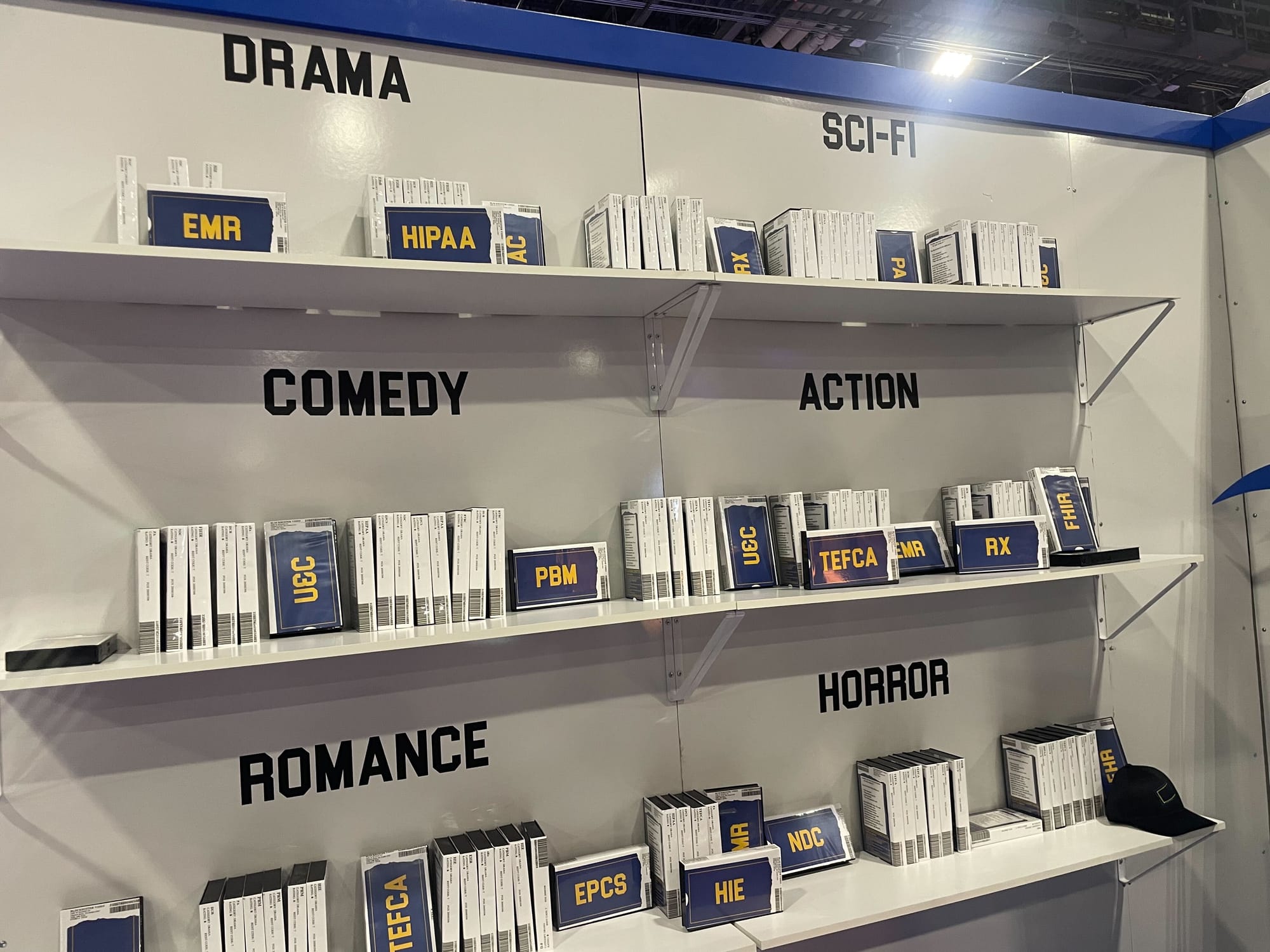 When you arrive at our “booth” at HLTH, you’re first met with old VHS cassettes titled with somewhat meaningless alphabet soup EHR, ERX, FHIR —a playful representation of all the jargon and “tech” in pharmacy. It's all VHS.