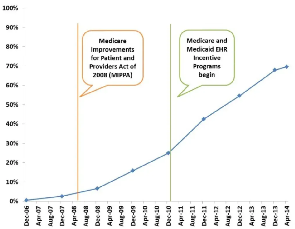 Up until this point, the usage of e-prescribing had actually been minimal, in spite of previous legislation—in December of 2008, only 7% of physicians were electronically prescribing through an EHR (Electronic Health Record) [9]. The issue was more rooted in the fact that widespread adoption of EHR software was lagging, which also meant data standards were inconsistent across different hospital and clinic settings—in 2008, less than 10% of Acute Care Hospitals were using EHR software [12].