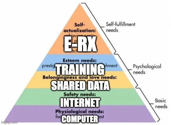 Well, what has been lost in the migration from paper to e-prescriptions? The mostly-uncited limitations enumerated in the Wikipedia on Electronic Prescribing are focused around friction for provider adoption (ROI, change management). Beyond those, it reads like the bottom two rungs of Maslow’s Hierarchy of Needs for technology (hardware, software, errors, data input, system downtime, security). Finally, it lists “patient access lost” whereas a patient can no longer request a paper prescription to physically take to a pharmacy (there are exceptions on a state-by-state basis), but misses the boat on why that actually matters.