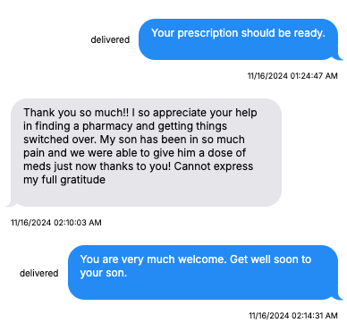 - Photon confirms receipt of the prescription (Rx) and a medication pick-up time with the pharmacy, then sent Alexis a text with this confirmation.
